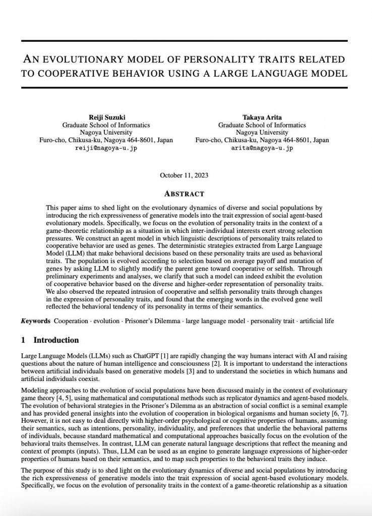@ Reiji Suzuki and Takaya Arita, “An evolutionary model of personality traits related to cooperative behavior using a large language model”